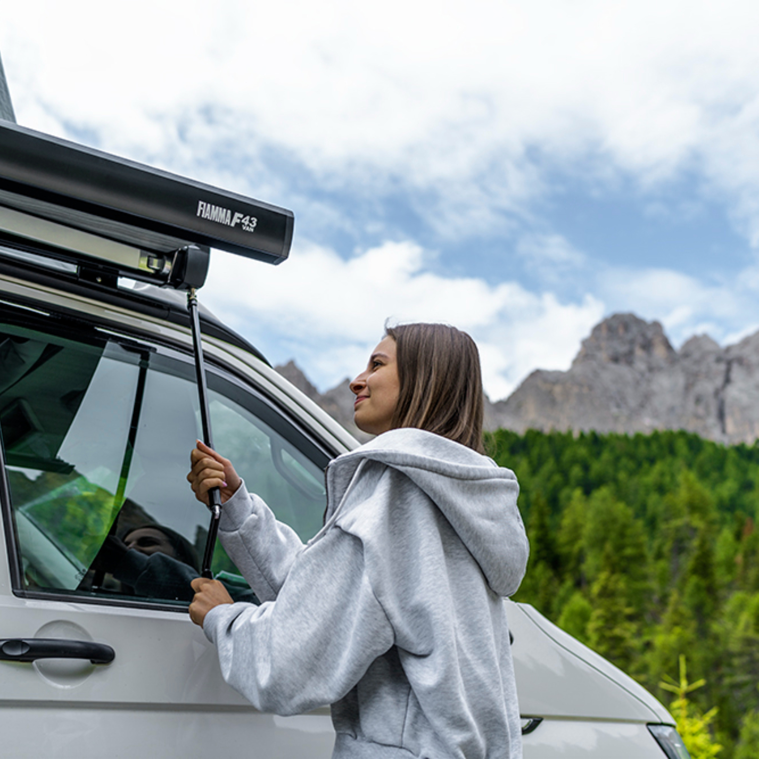 Opening via winch with magnetic catch which is concealed in the cover, conveniently positioned due to the awning’s mounting height on the van