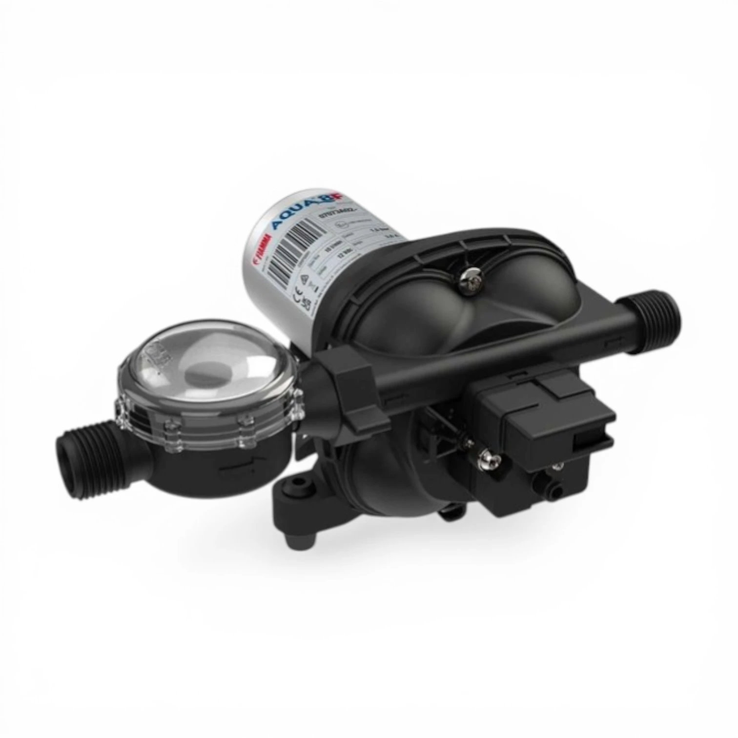 The new 2025 10L Aqua 8F Pump is equipped with an adjustable pressure switch for customizable operation. It has a 12V power supply and 4 chambers for high flow of water.